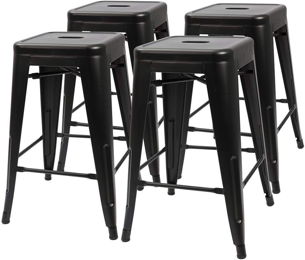 This Set of 4 - 24-in. Indoor/Outdoor Backless Stacking Black Metal Barstools for convenient storage & space saving use hand-holds make the stools easily to be picked up or moved each lightweight but sturdy stool weighs 11 lbs, while with 330 lbs weight capacity x-brace support under the seat provides additional stability & durability non-mar rubber feet prevent from sliding and scratching floors heavy duty metal construction each metal bar stools 30'' tall, seat size 12 x 12''.